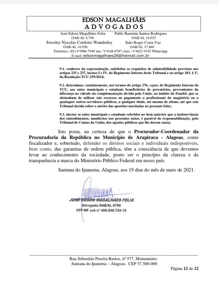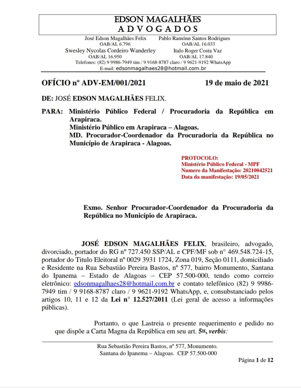 Nesta semana, o advogado, ex-vereador e ex-vice prefeito de Santana, Edson Magalhães, protocolou um documento, no Ministério Público Federal / Procuradoria da República em Arapiraca - Alagoas (MPF), no qual apela a aquele poder, ajuda para saber detalhes sobre os recursos recebidos pela Prefeitura de Santana do Ipanema.
