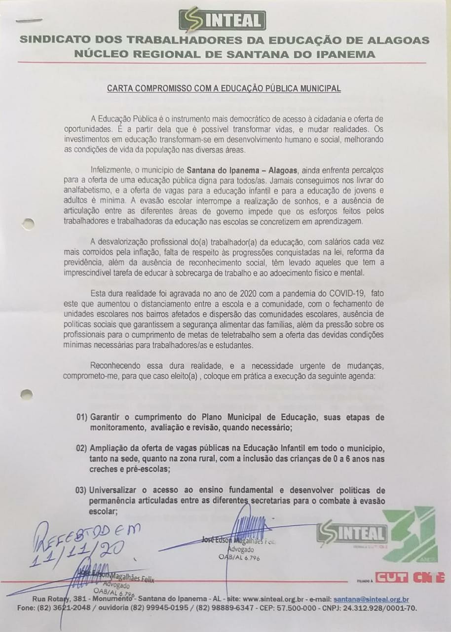 Edson Magalhães desde 2001 ainda como vereador já defendia os direitos para todos os servidores da educação, cobrando e fiscalizando a gestão pública municipal, garantindo-lhes o que determina a lei. Magalhães ainda em 2020 assinou junto aos representantes do SINTEAL uma carta compromisso com a educação pública municipal.