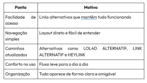 Ter várias formas de entrada dá tranquilidade. Mesmo que um link não abra em algum momento, existe outro pronto para continuar o uso. Isso evita qualquer pausa indesejada e traz um sentimento de segurança. Para quem gosta de manter seu ritmo, isso faz diferença. Assim, LOL4D cria um ambiente fluido e estável dentro da rotina digital.