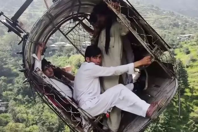 Drone registra imagens de pessoas presas em teleférico no Paquistão